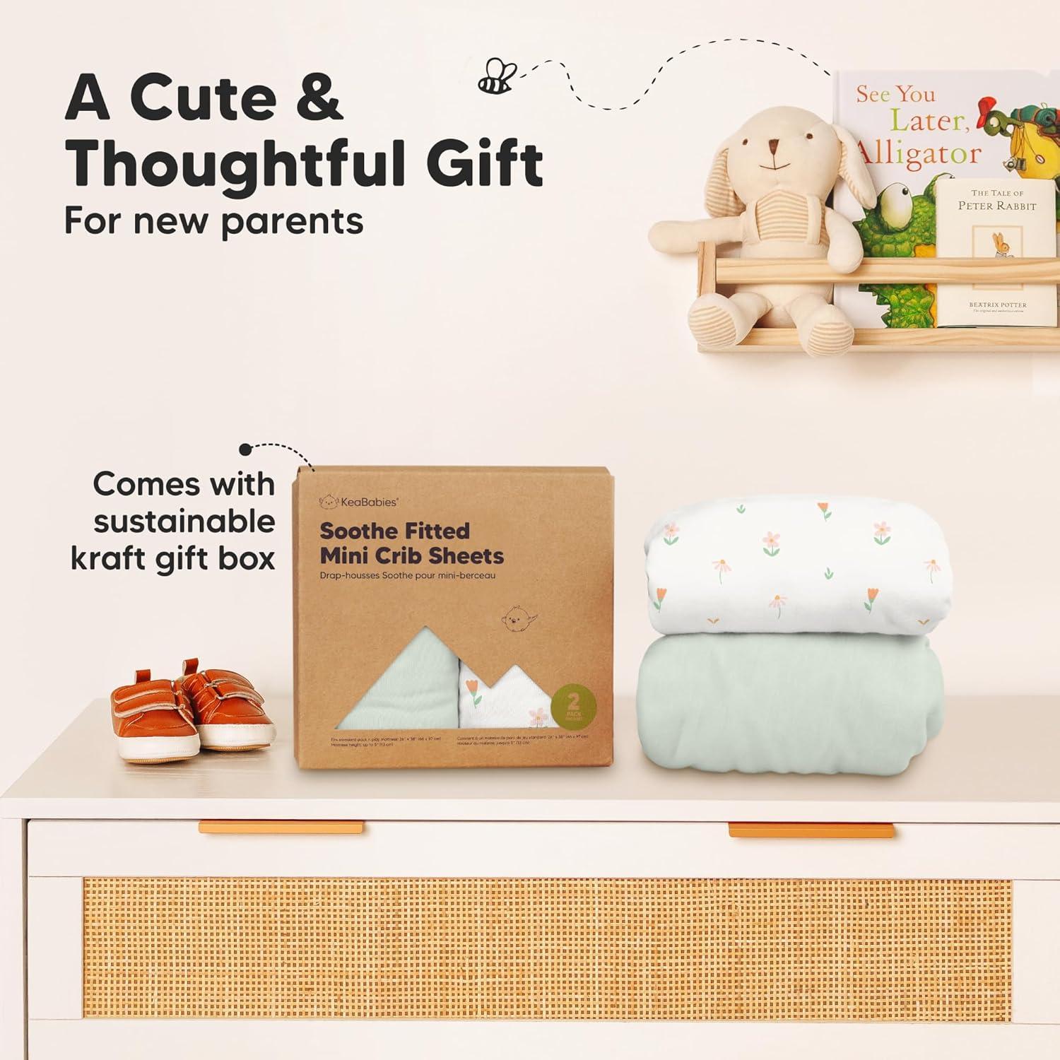 2-Pack Mini Crib Sheets – Each KeaBabies Soothe Mini Crib Sheets set comes with two organic mini crib sheets for boys and girls that can perfectly fit the pack and play mattress pads and mini crib mattresses sized at 38” x 26” up to 5” height.