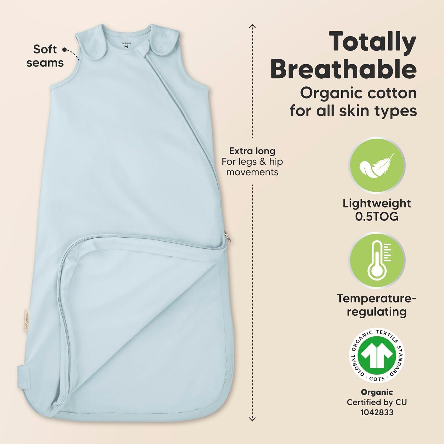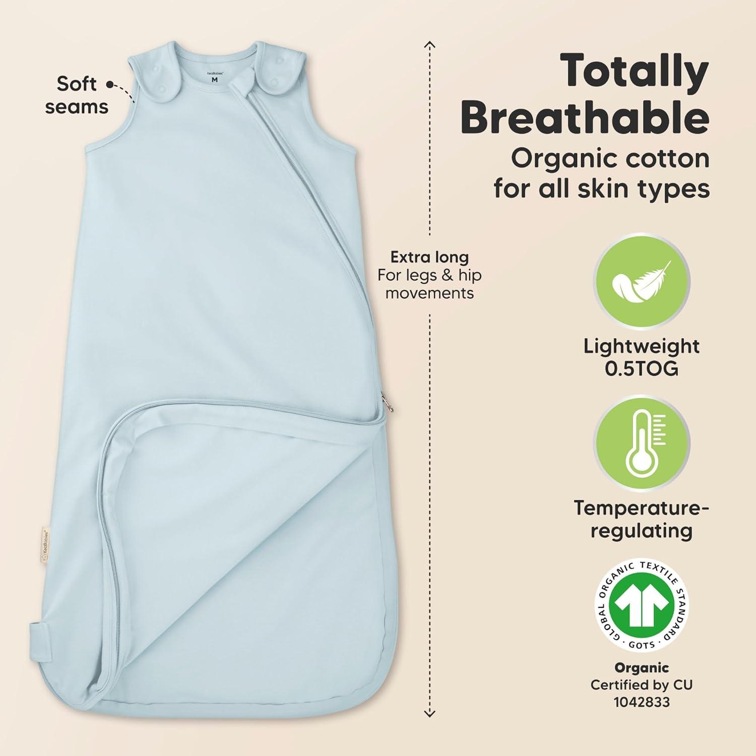 Our Soothe Sleep Sack for babies is made with ultra-soft Organic Cotton (GOTS Certified by CU 1042833). It is lightweight and highly breathable, making it a highly-raved 0.5 TOG baby sleeping sack for all seasons.