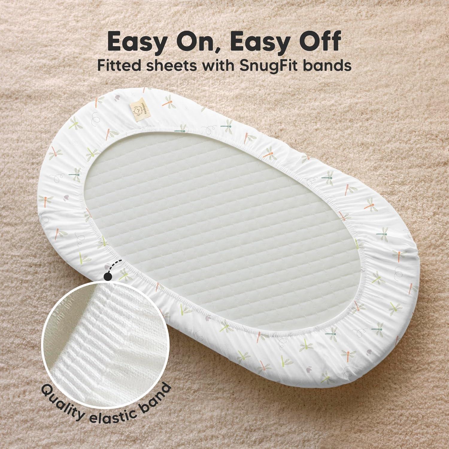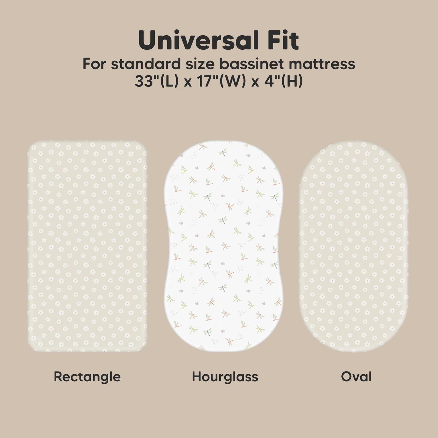 2-Pack Bassinet Fitted Sheets – KeaBabies Soothe Bassinet Mattress Sheets, sized at 33″ x 17″ with a depth of up to 4″, provide a universal fit for all bassinet mattress pad types. They can be used as hourglass, oval, rectangle bassinet sheets.