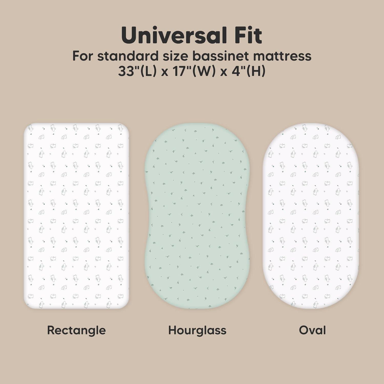 2-Pack Bassinet Fitted Sheets – KeaBabies Soothe Bassinet Mattress Sheets, sized at 33″ x 17″ with a depth of up to 4″, provide a universal fit for all bassinet mattress pad types. They can be used as hourglass, oval, rectangle bassinet sheets.