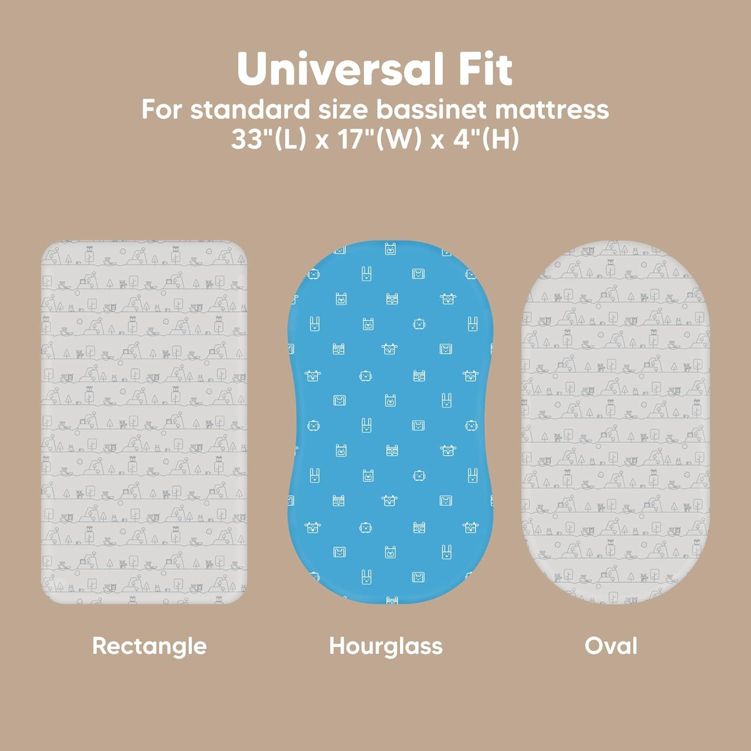 2-Pack Bassinet Fitted Sheets – KeaBabies Soothe Bassinet Mattress Sheets, sized at 33″ x 17″ with a depth of up to 4″, provide a universal fit for all bassinet mattress pad types. They can be used as hourglass, oval, rectangle bassinet sheets.