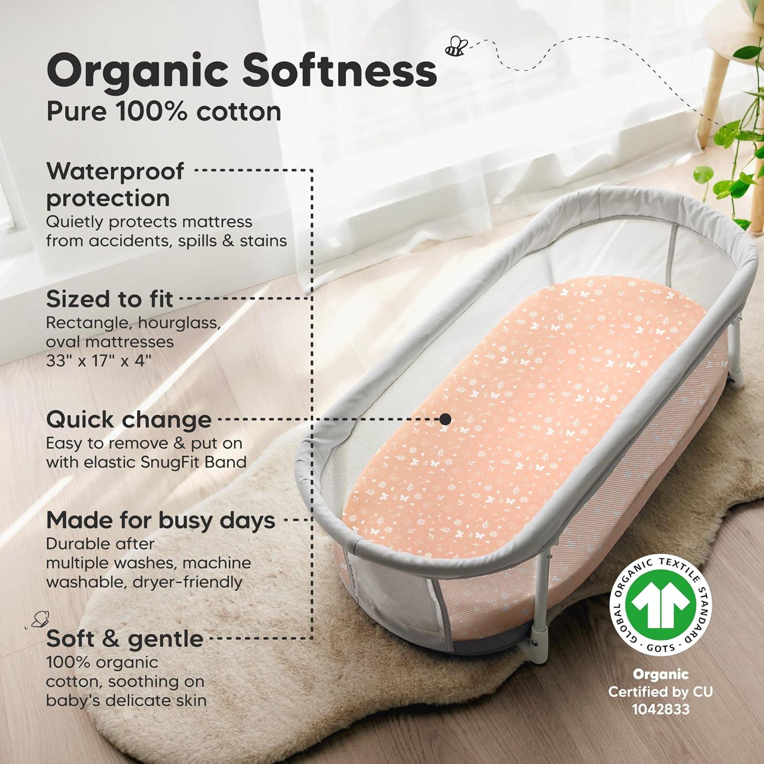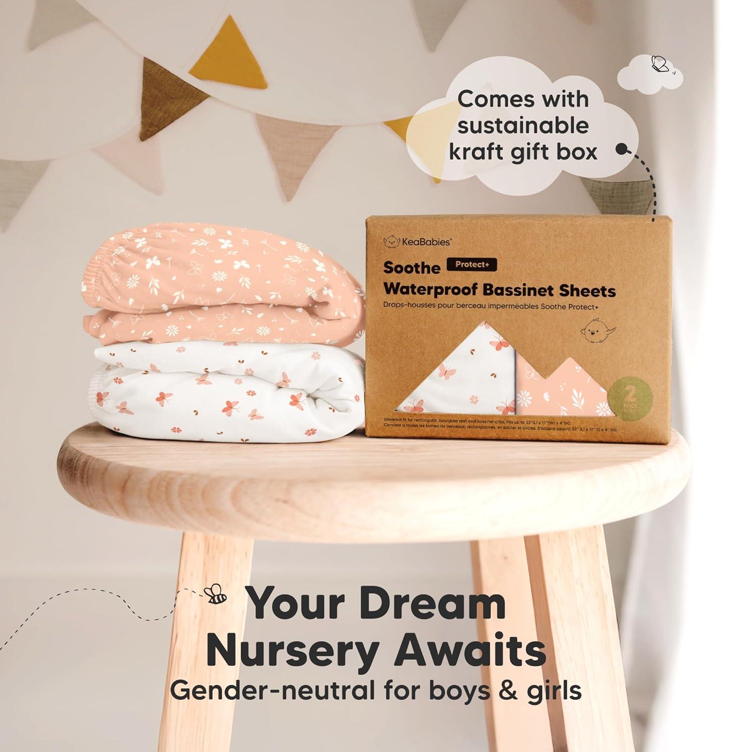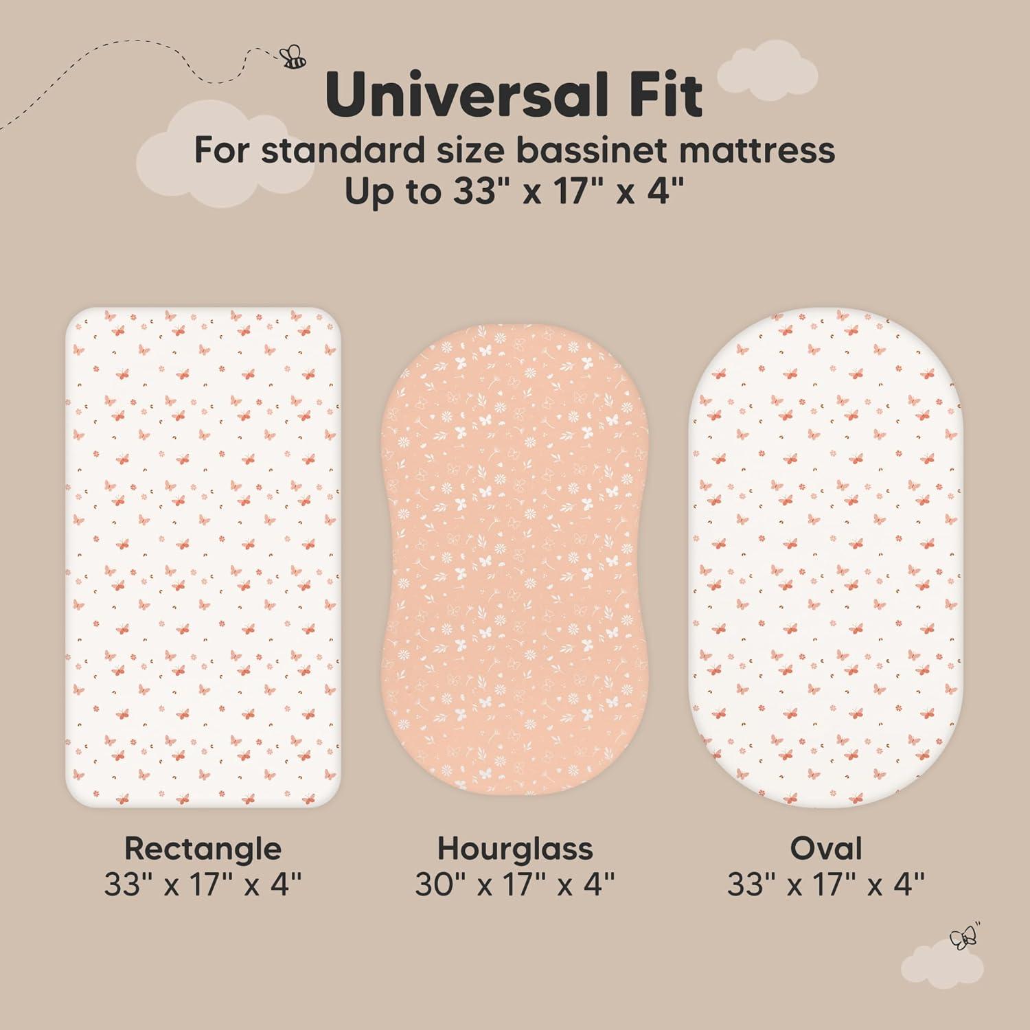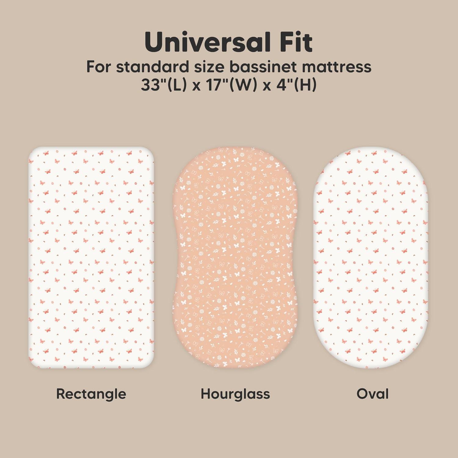 2-Pack Bassinet Fitted Sheets – KeaBabies Soothe Bassinet Mattress Sheets, sized at 33″ x 17″ with a depth of up to 4″, provide a universal fit for all bassinet mattress pad types. They can be used as hourglass, oval, rectangle bassinet sheets.