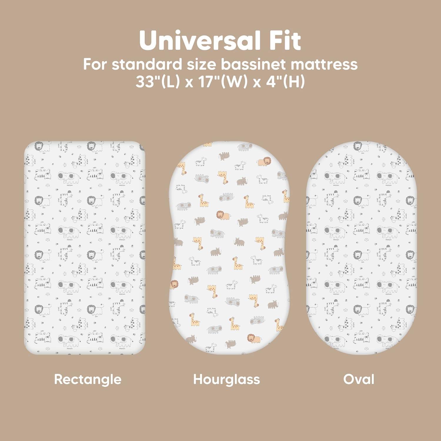 2-Pack Bassinet Fitted Sheets – KeaBabies Soothe Bassinet Mattress Sheets, sized at 33″ x 17″ with a depth of up to 4″, provide a universal fit for all bassinet mattress pad types. They can be used as hourglass, oval, rectangle bassinet sheets.