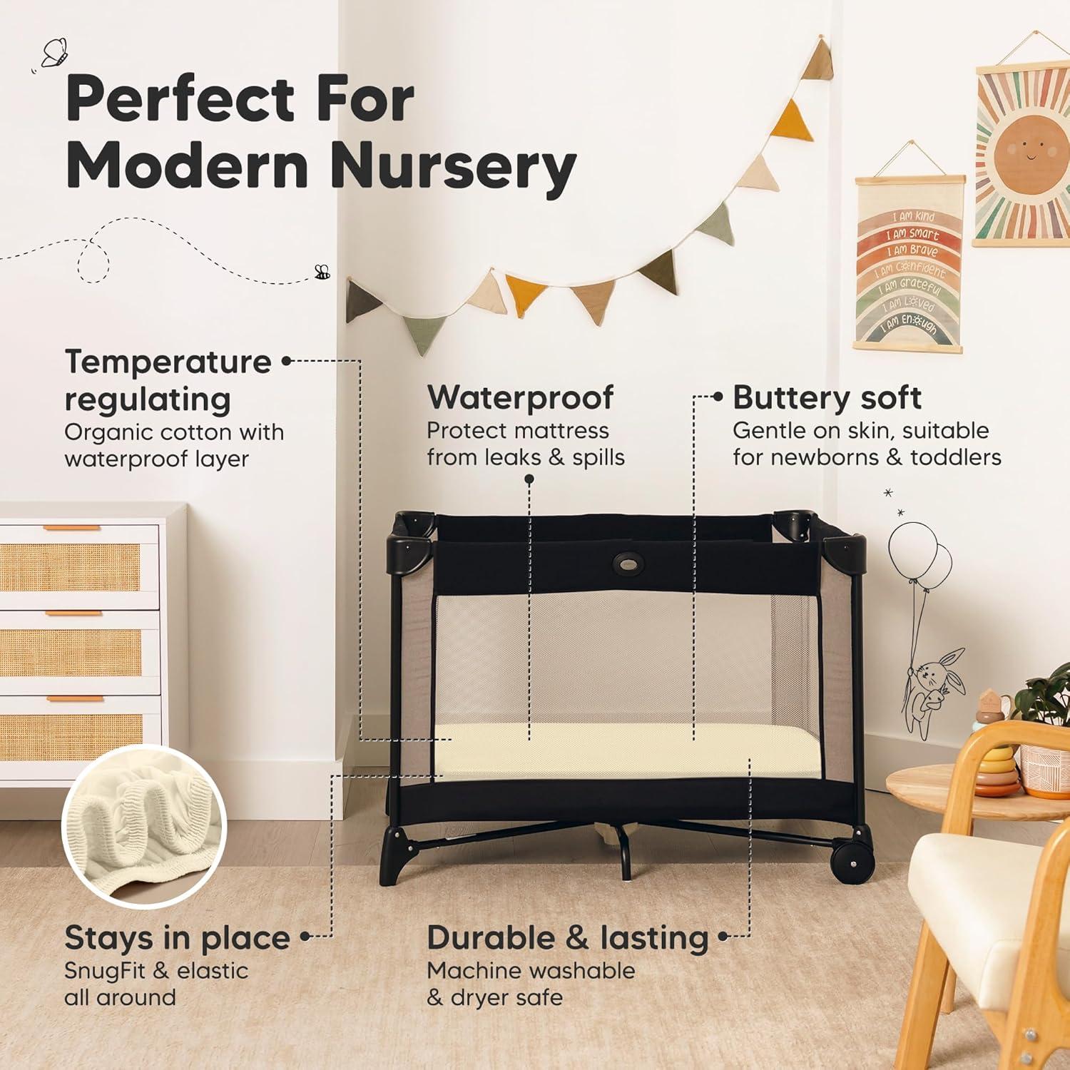 Easy To Put On – Our mini waterproof crib sheet uses SnugFit Tech, a smart fabric knit that allows the fabric to stretch when you are fitting or removing the mini crib sheets neutral from the toddler crib. No more struggling with rigid fabric!