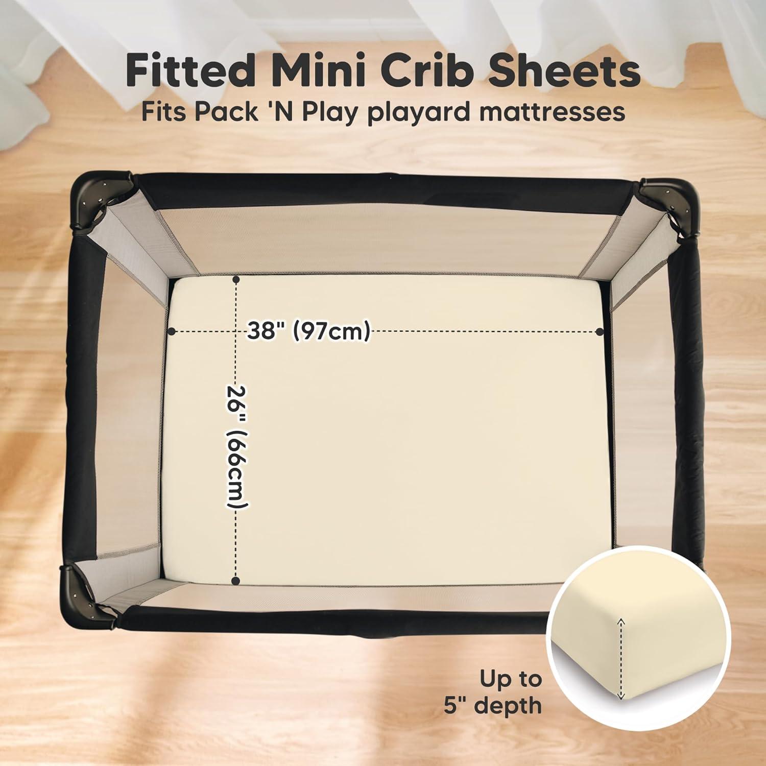 2-Pack Pack and Play Sheets – Each KeaBabies Soothe Protect+ Mini Fitted Crib Sheet set comes with two waterproof playard sheets for both boy and girl that can perfectly fit the standard Graco pack n play crib mattress sized at 38” x 26” up to 5”.
