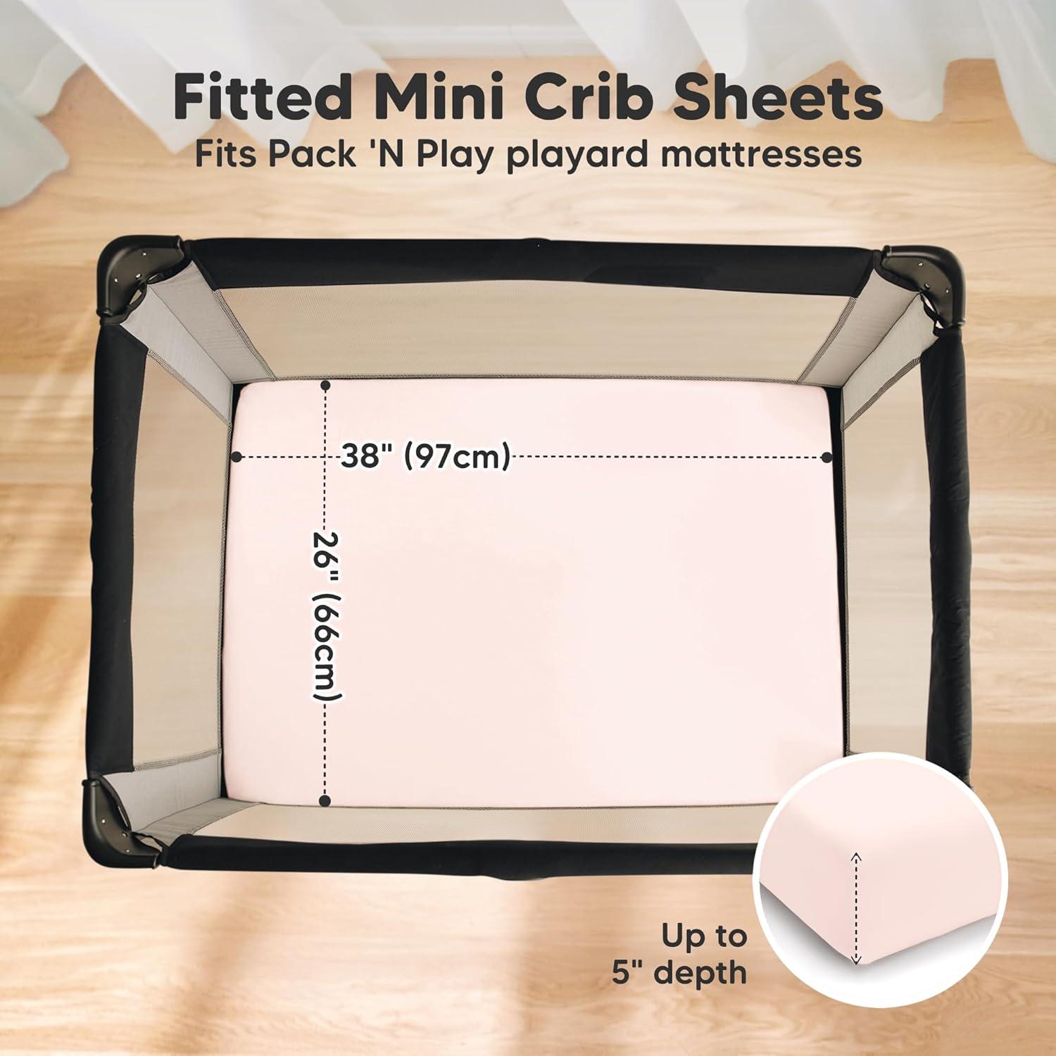 2-Pack Pack and Play Sheets – Each KeaBabies Soothe Protect+ Mini Fitted Crib Sheet set comes with two waterproof playard sheets for both boy and girl that can perfectly fit the standard Graco pack n play crib mattress sized at 38” x 26” up to 5”.