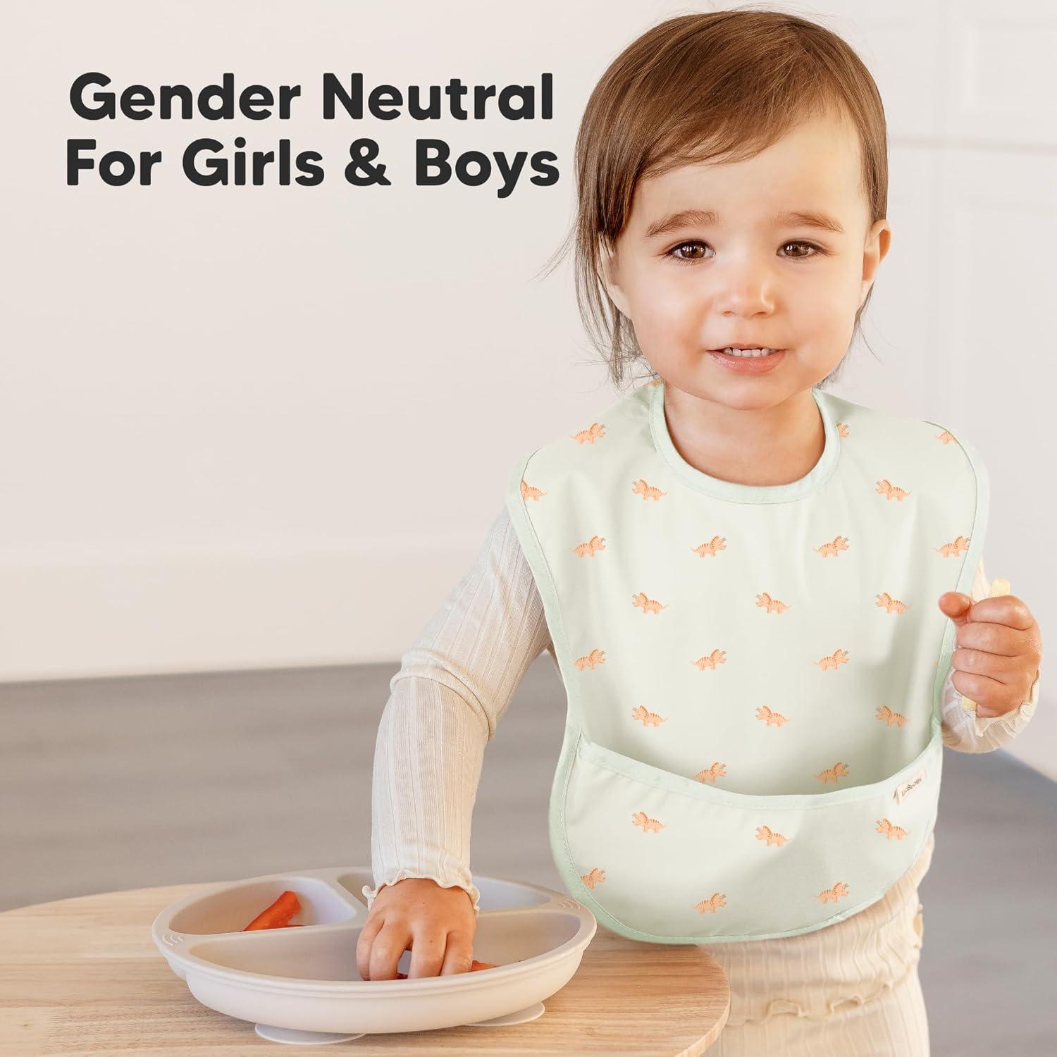 Covers Upper Chest and Shoulders – Your baby can now enjoy self-feeding without soiling their clothes with the mess-proof bibs. This toddler bib for baby boys and girls comes with a wide food catcher pocket holds fallen food crumbs and purée spills.