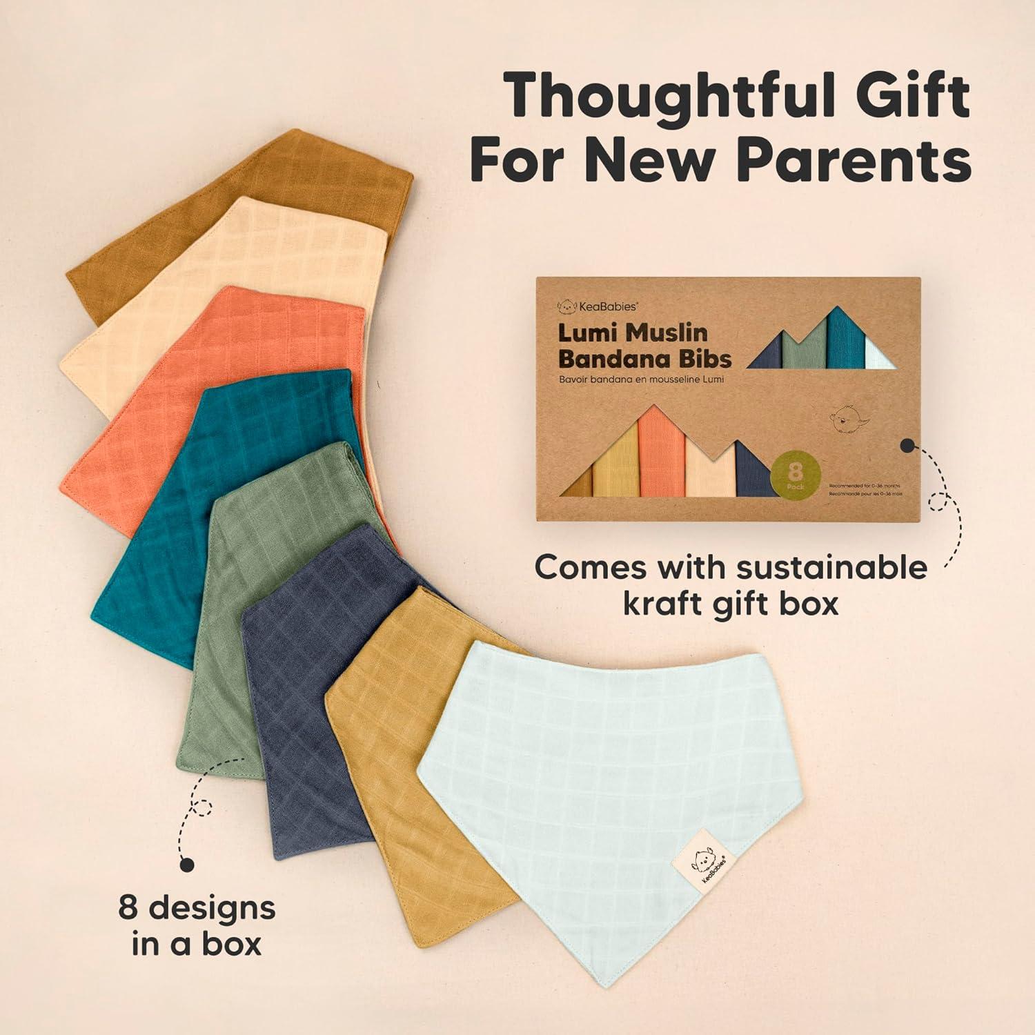 Ideal Baby Gift – The 8-Pack Lumi Muslin Organic Baby Drool Bibs come beautifully packaged in a sustainable kraft box, making them a cute and thoughtful present for baby shower, baby registry, Christmas, and birthdays.