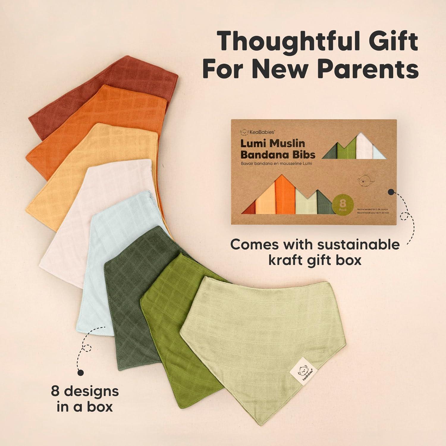 Ideal Baby Gift – The 8-Pack Lumi Muslin Organic Baby Drool Bibs come beautifully packaged in a sustainable kraft box, making them a cute and thoughtful present for baby shower, baby registry, Christmas, and birthdays.
