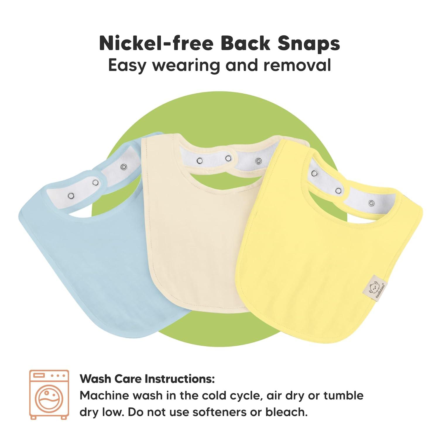3 Adjustable Size With Soft Seams – With 2 sets of easily fasten nickel free snaps, you can adjust the girl and boy bibs according to your baby’s neckline. The soft wrapped organic cotton seams provide extra comfort for your baby and they won’t feel a thing while having the baby cotton bibs on. Suitable for newborn babies up to 24 months.