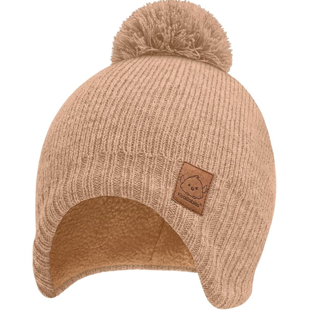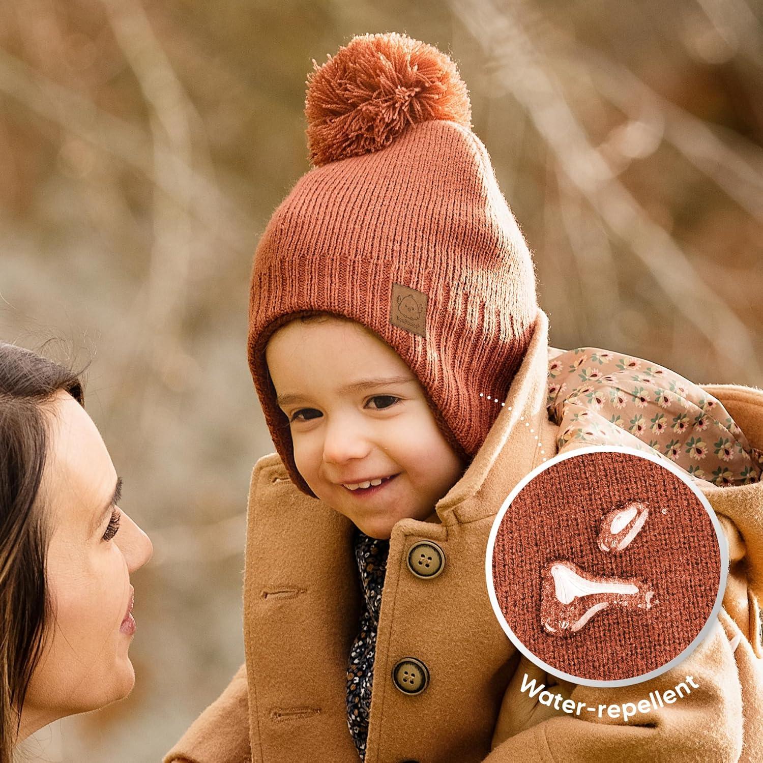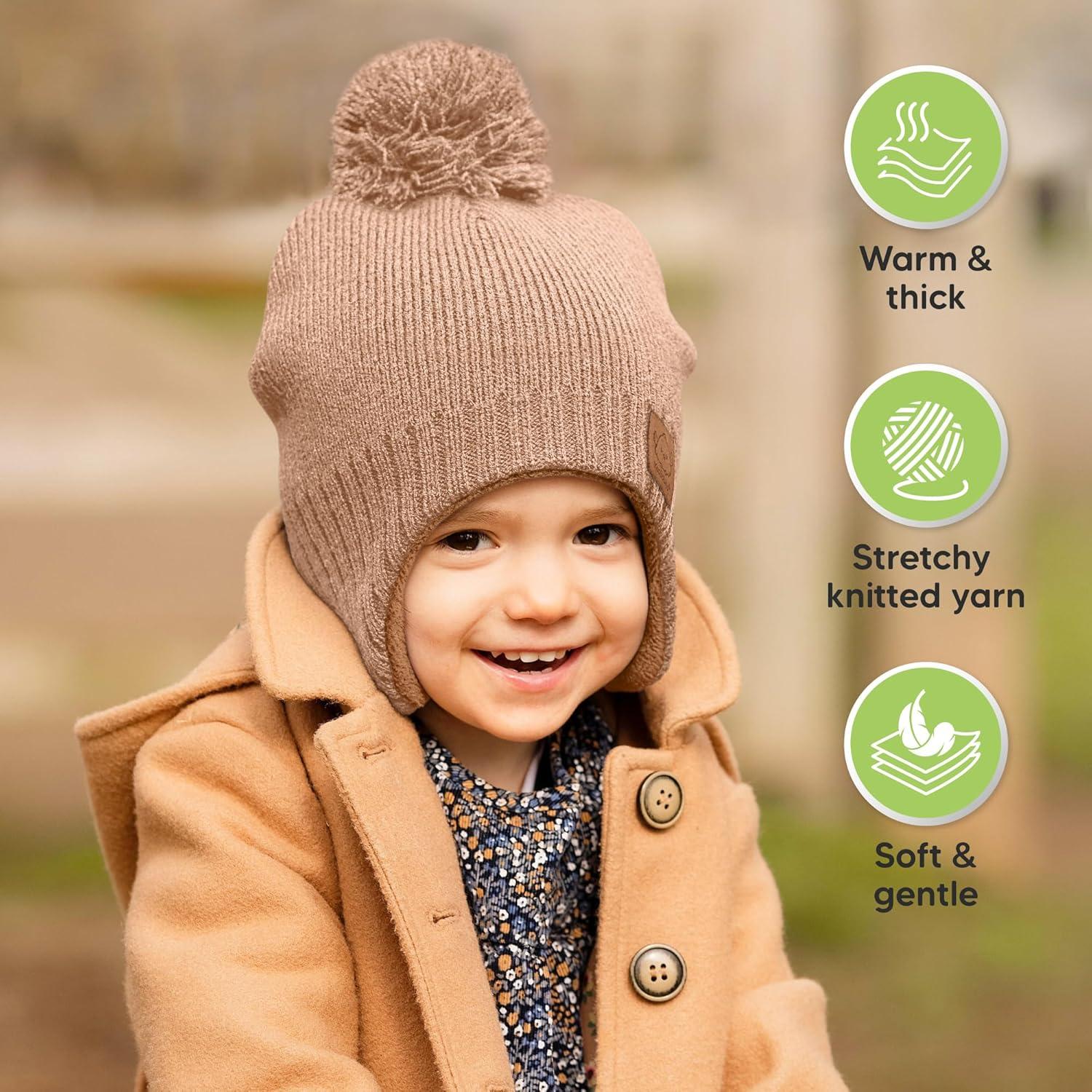 Baby Beanies, Baby Hats for Boys, Girls - Cute Toddler Winter Hat, Soft & Stretchy Beanies for Infant, Newborn 6-36 Months, Cozy & Warm with Earflap Muff & Pom (Regalia)(Dune)