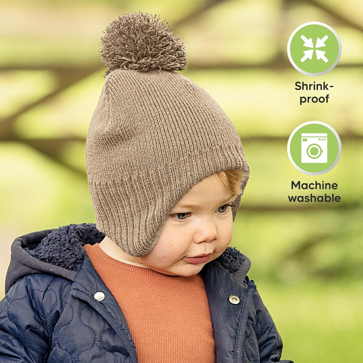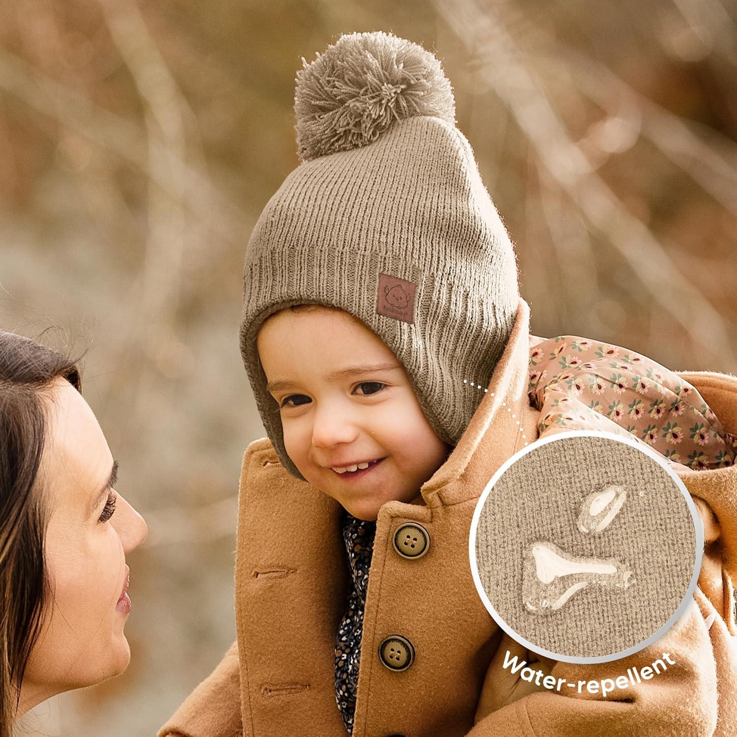 Baby Beanies, Baby Hats for Boys, Girls – Cute Toddler Winter Hat, Soft & Stretchy Beanies for Infant, Newborn 6-36 Months, Cozy & Warm with Earflap Muff & Pom (Regalia)(Taupe)