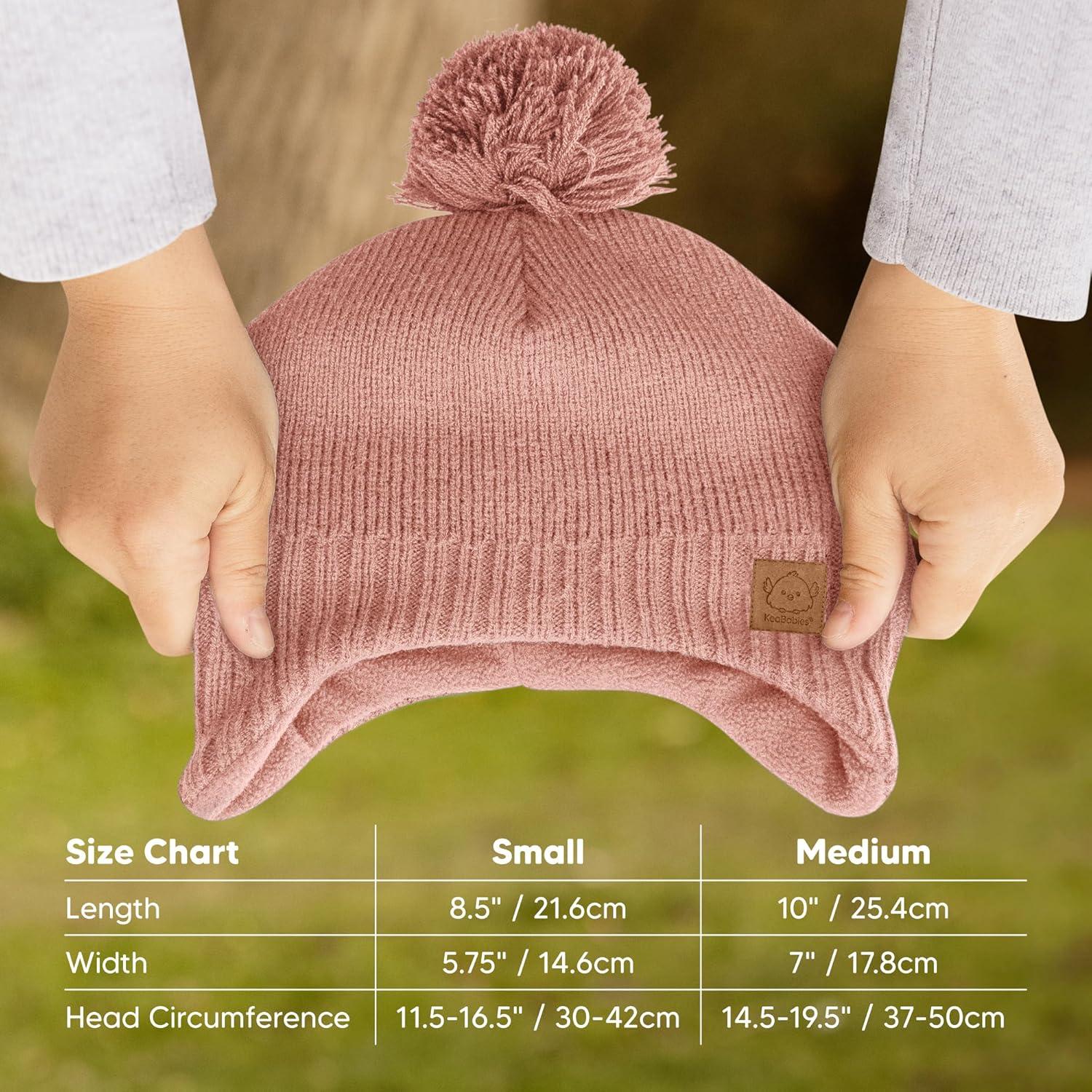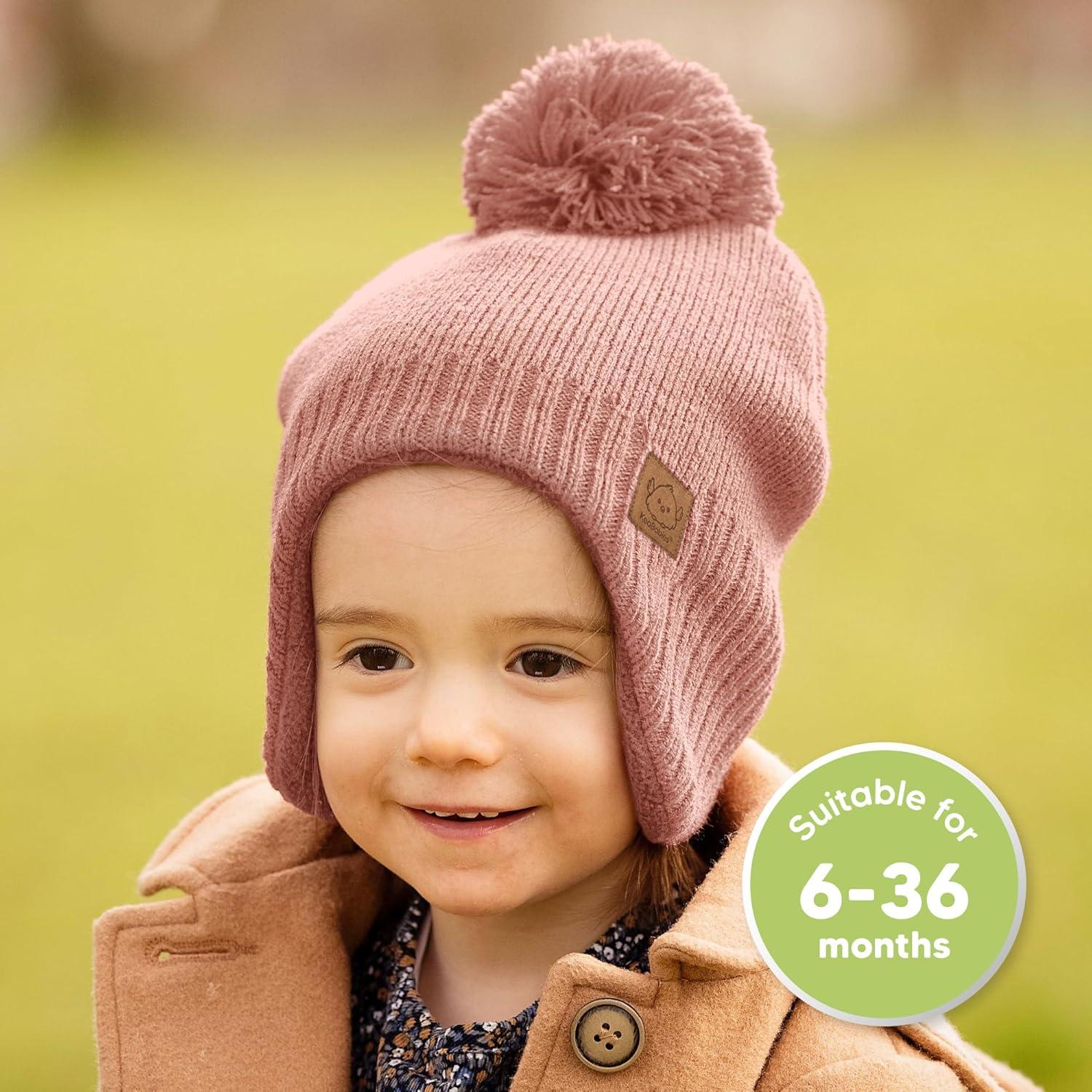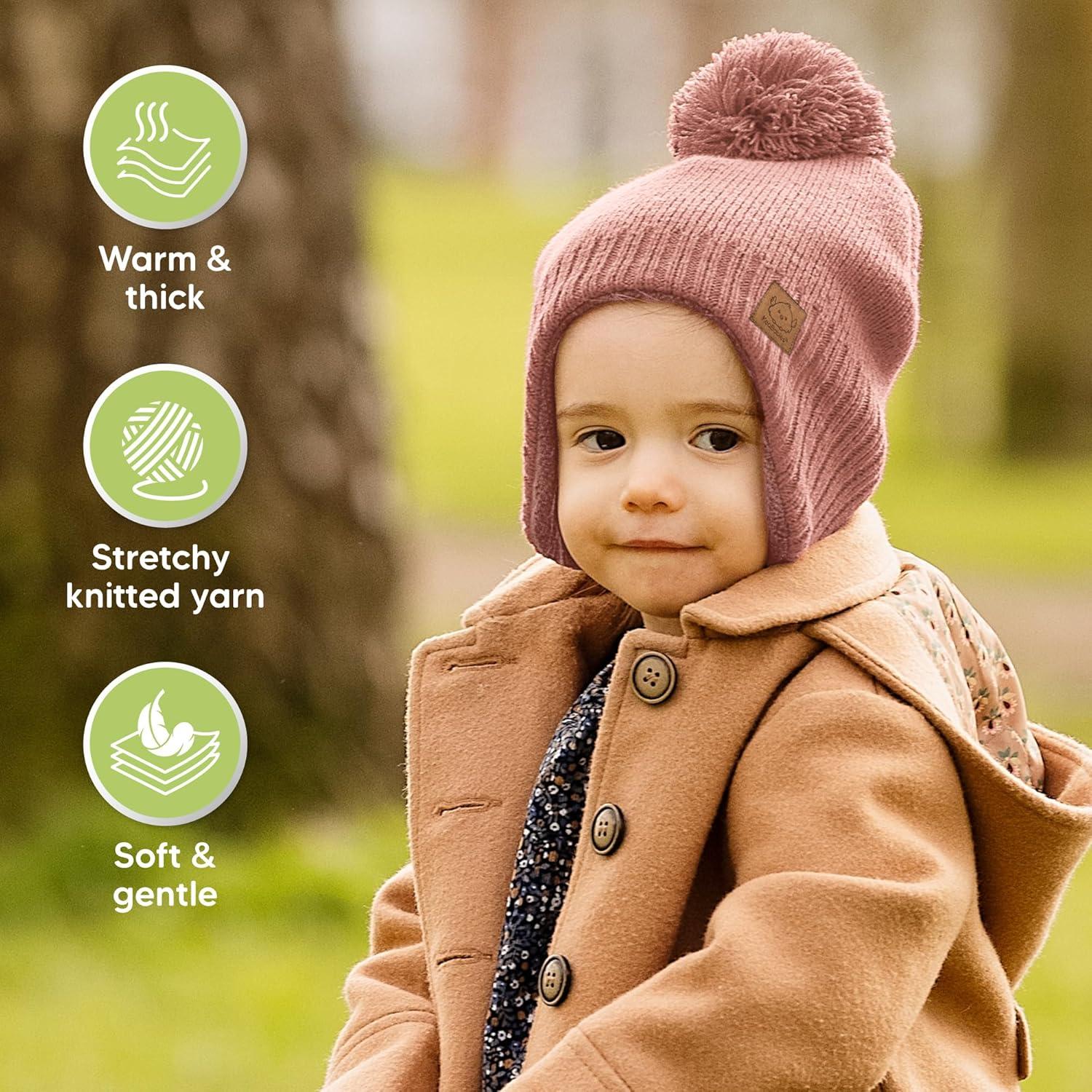 Baby Beanies, Baby Hats for Boys, Girls – Cute Toddler Winter Hat, Soft & Stretchy Beanies for Infant, Newborn 6-36 Months, Cozy & Warm with Earflap Muff & Pom (Regalia)(Tea Rose)