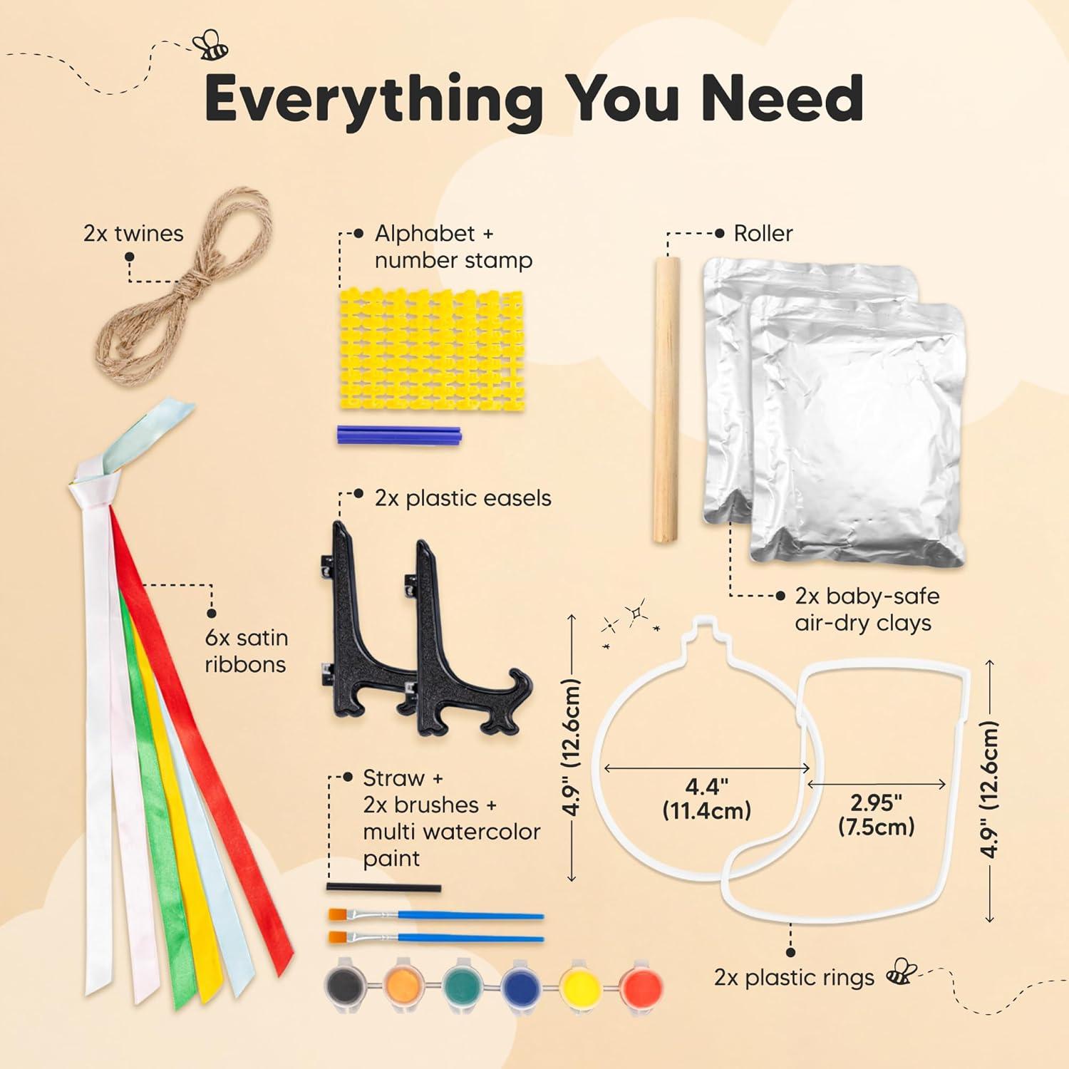 All-Inclusive Kit – Our Trove Baby Handprint Ornament Kit for babies offer 2 baby-safe airdry clay, 2 shaped rings, acrylic paints, 2 paint brushes, 6 satin ribbons, 2 twig strings and alphabet stamps. DIY personalized newborn gifts for your babies!