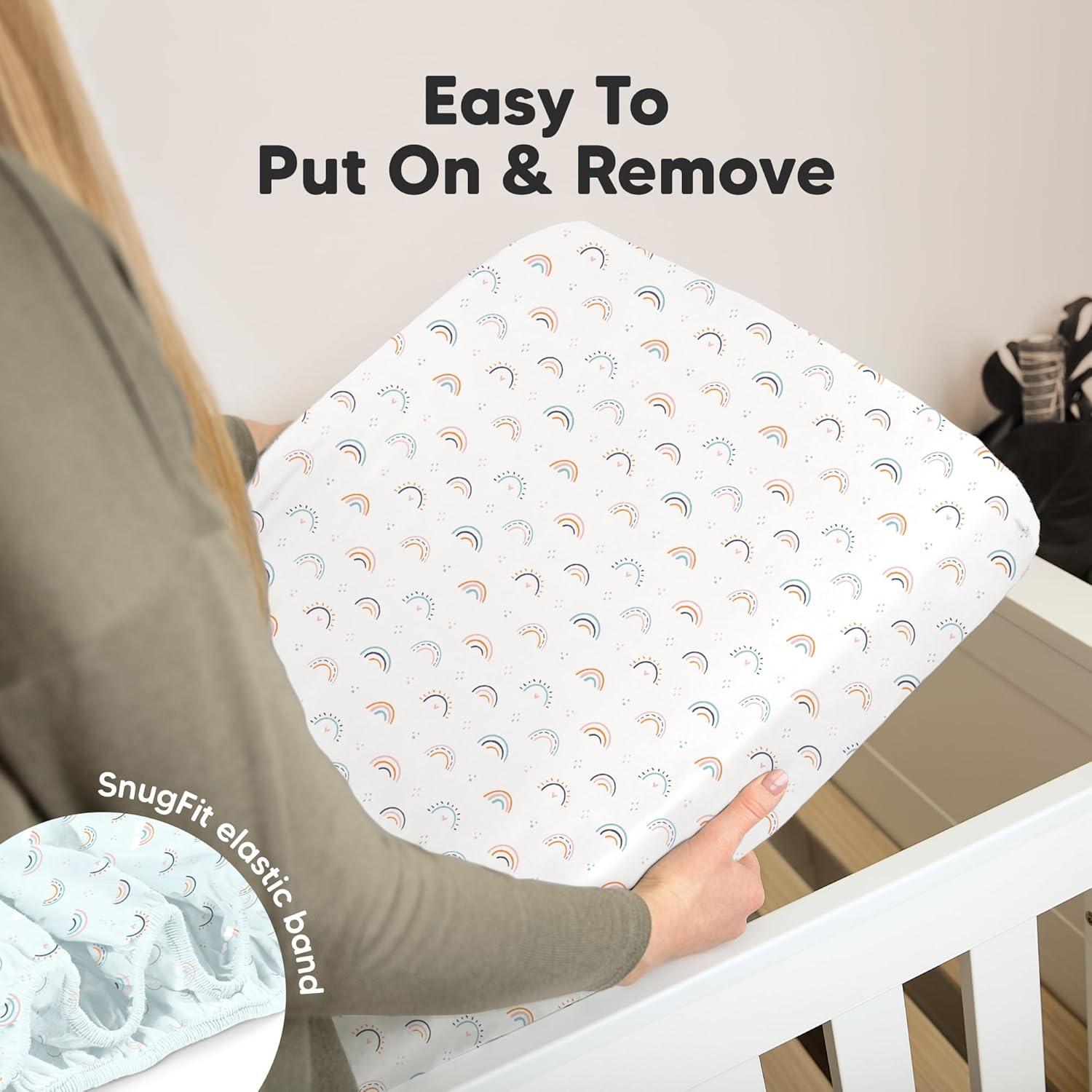 Easy To Put On – Our baby sheets for crib use SnugFit Tech, a smart fabric knit that stretches effortlessly for quick fitting and removal of the toddler bed sheets. No more struggling with rigid fabric!
