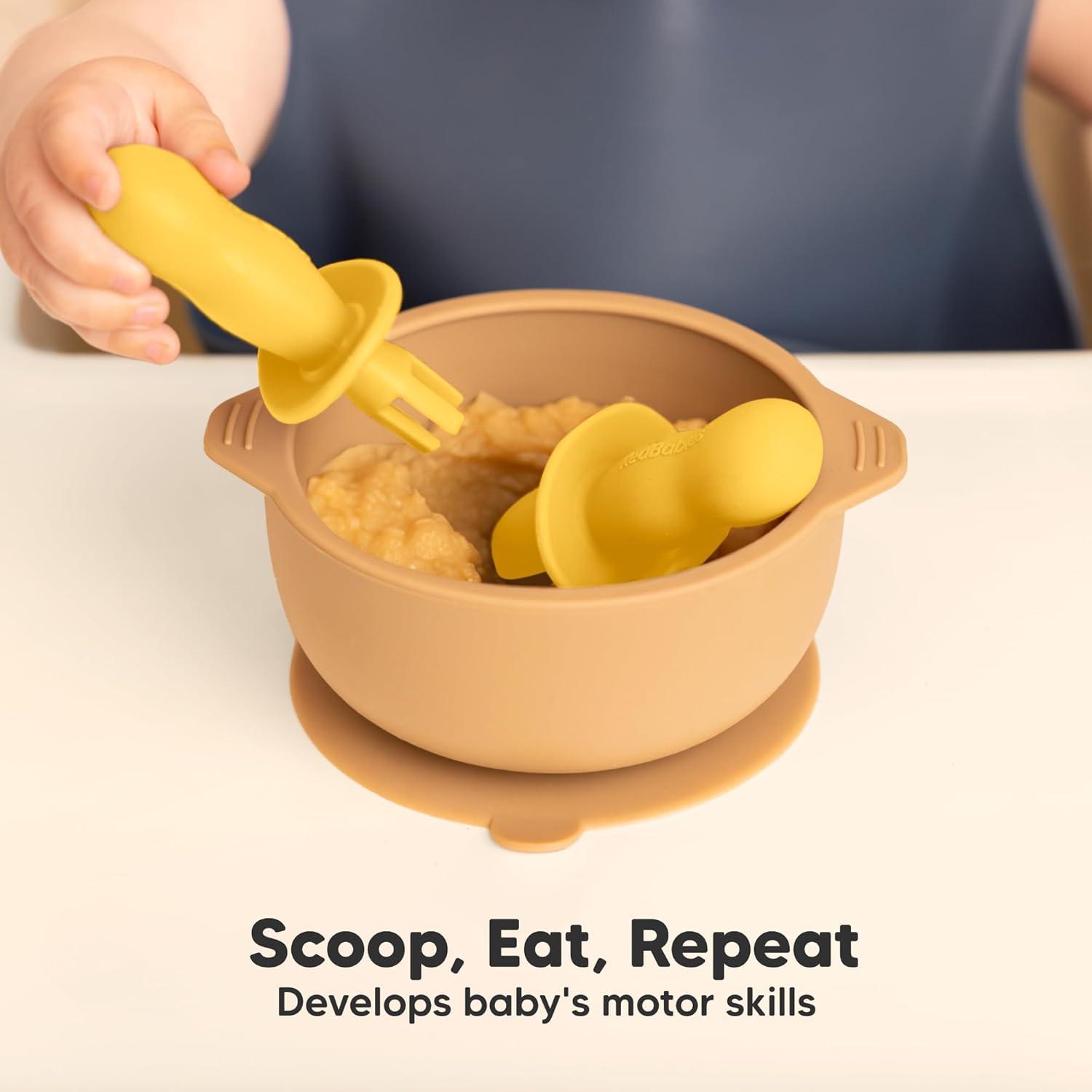 KeaBabies 4-Pack Silicone Baby Spoons and Forks Set - Baby Led Weaning Utensils 6-12 Months, Self Feeding Toddler Spoon & Fork for Training, Teething, Easy to Hold, BPA-Free Silicone (Desert)(Valiant)