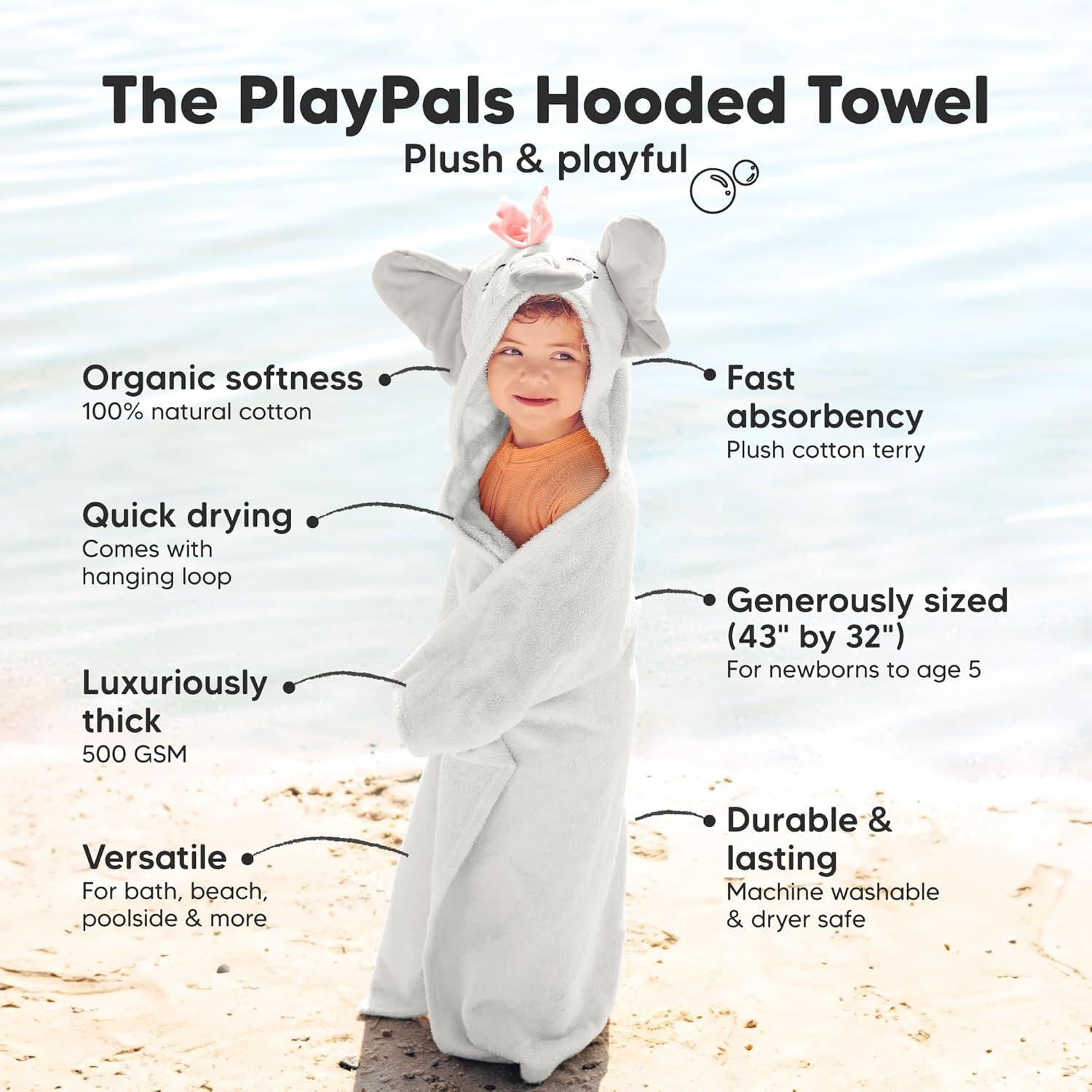 PlayPals Magic – More than just a baby towel, the PlayPals Hooded Towel is a bath-time buddy. With an adorable animal hoodie, it turns drying off at the beach, pool, or bath into fun. This cozy companion makes routine moments playful and creative.