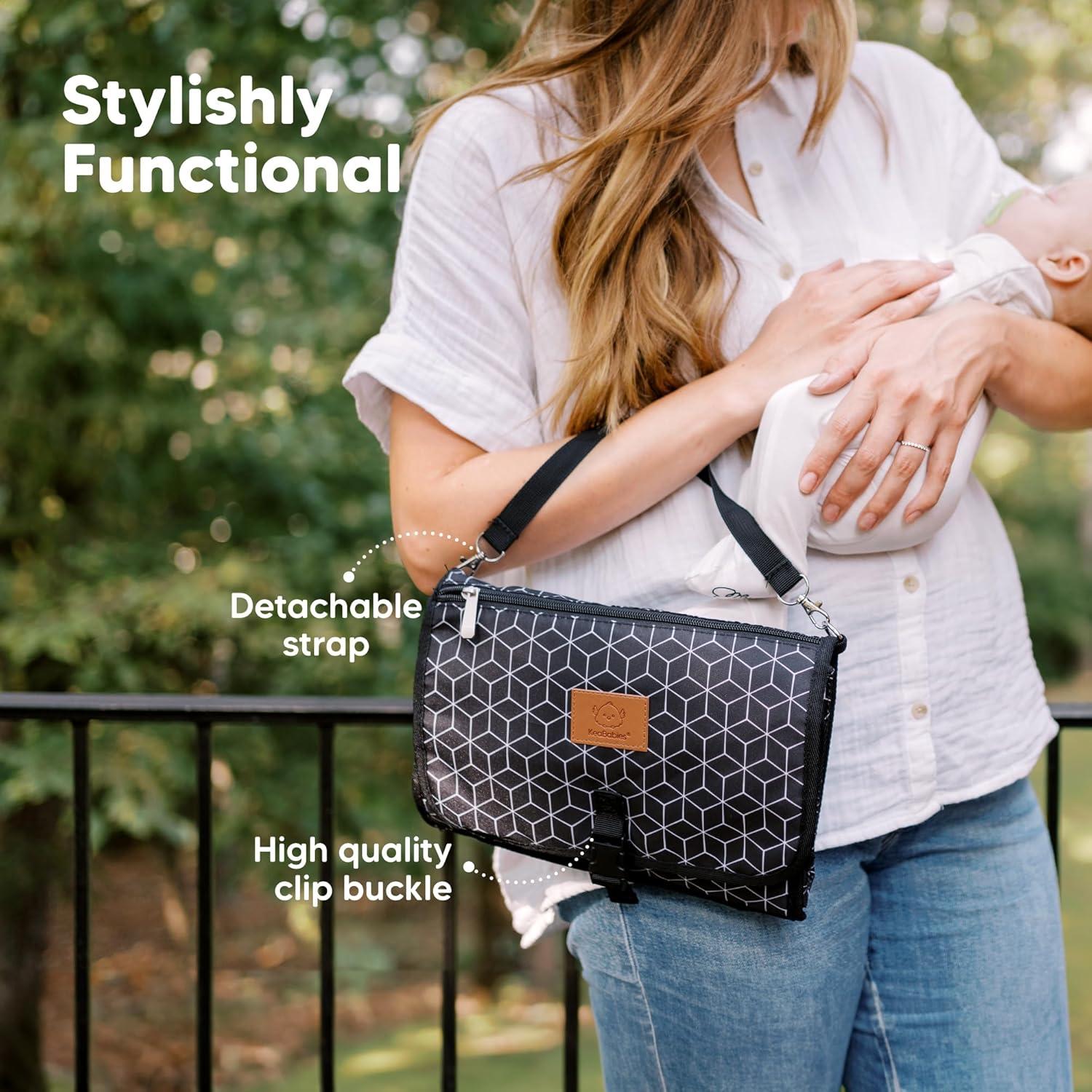KeaBabies Portable Diaper Changing Pad – Large Waterproof Baby Changing Mat, Compact Travel Diaper Clutch, Functional Pockets Fit Newborn Essentials, Wipeable & Padded Baby Changer (Prism)(Black Geo)