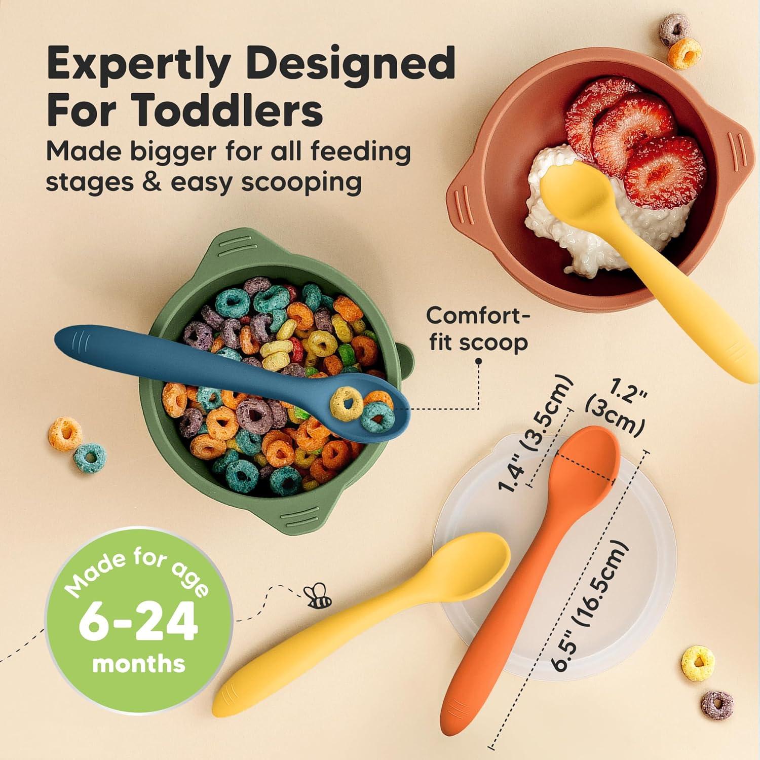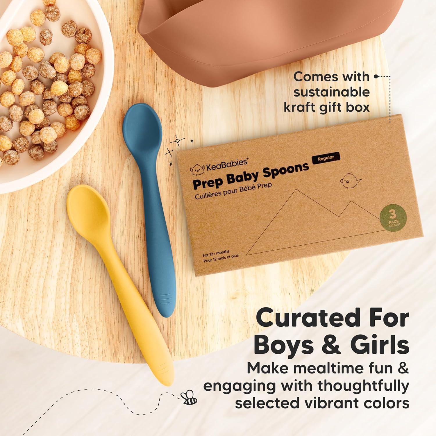 Safer Silicone – KeaBabies 3-Pack Prep Silicone Baby Spoons Set is made from 100% food-grade, BPA-free silicone. With a topple-free handle and comfort sized scoop, these toddler spoons help BLW toddlers build confidence as they learn self-feeding.