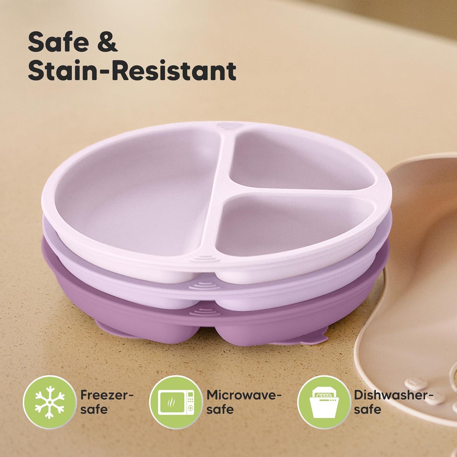 KeaBabies Suction Plates with Lids for Baby - 3-Pack 100% Silicone Toddler Plates with Suction, Divided, BPA-Free Baby Led Weaning Essentials for Kids, Dishwasher, Microwave Safe, Durable (Slate)(Amethyst)