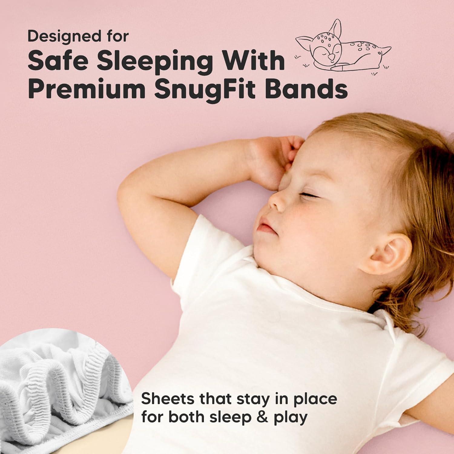SnugFit Fabric – Featuring SnugFit fabric technology, the Isla Mini Baby Crib Sheet stretches well for ease of fitting and removal of the mini crib playard sheets from pack n play mattress pads. No more struggling with rigid baby sheets.