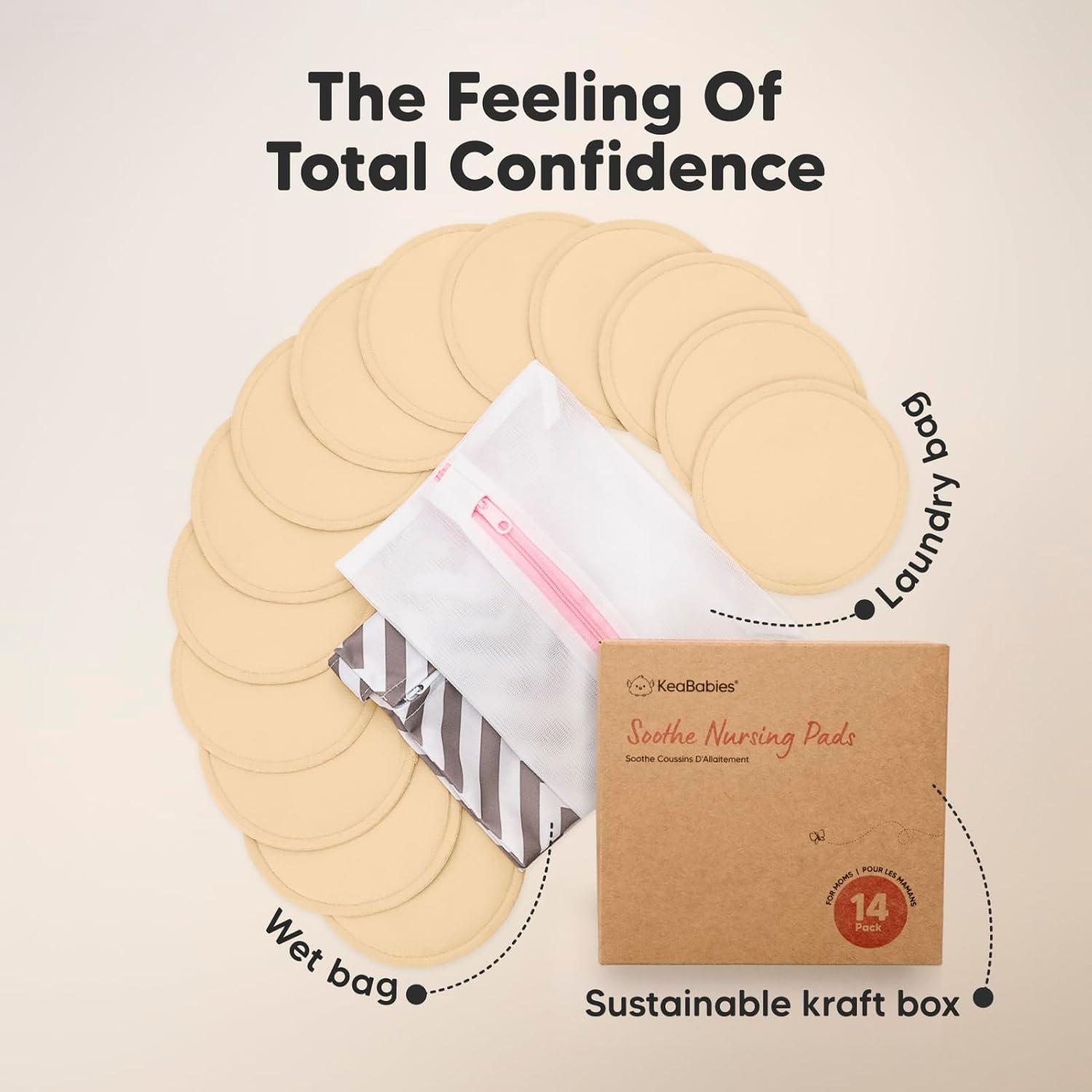 Soothe Nursing Pads Set – 14-pack viscose derived from bamboo nursing breast pads for breastfeeding, enough to last you for the week. Comes with a compact-sized wet bag for changing your reusable nipple pads throughout the day, while on the go.